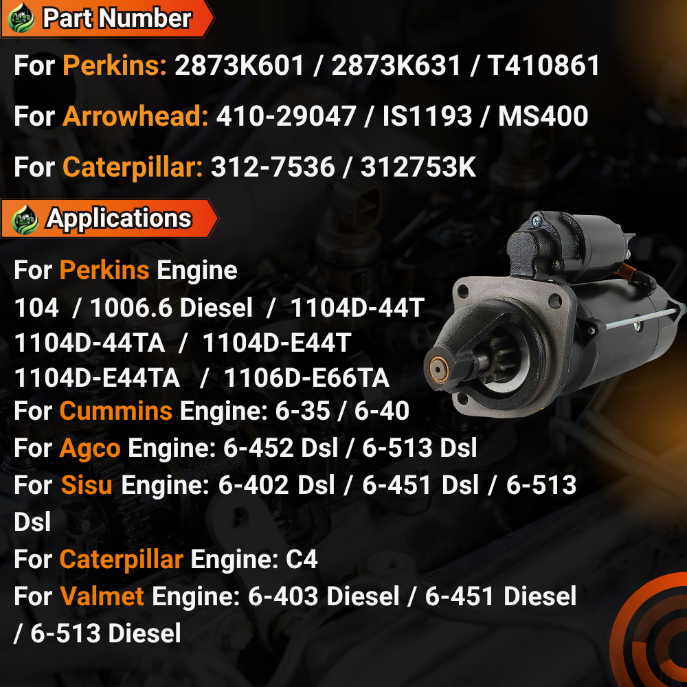 12V 10T 4.2KW Starter Motor 2873K601 2873K631 for Perkins Engine 1104D-E44T 1104D-E44TA 1104D-44T 1104D-44TA 1106D-E66TA