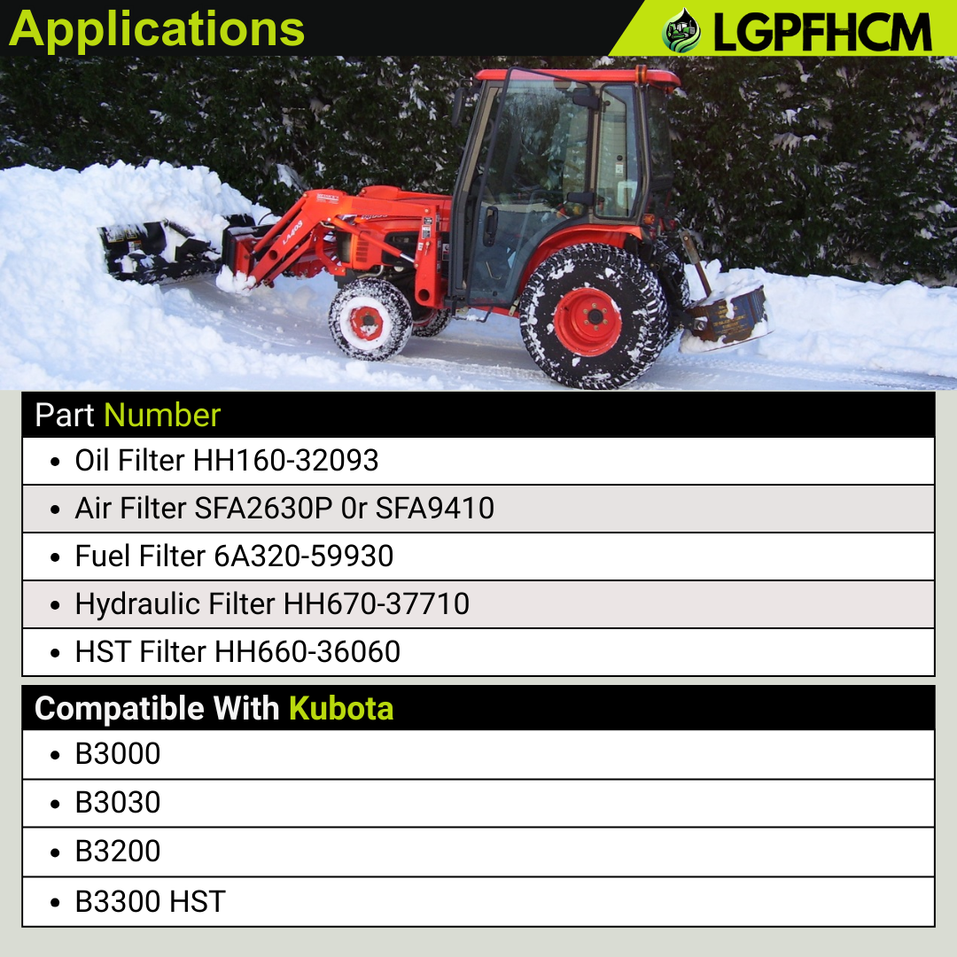 Part Number | Oil Filter HH160-32093, Air Filter SFA2630P 0r SFA9410, Fuel Filter 6A320-59930, Hydraulic Filter HH670-37710, HST Filter HH660-36060 | ||
